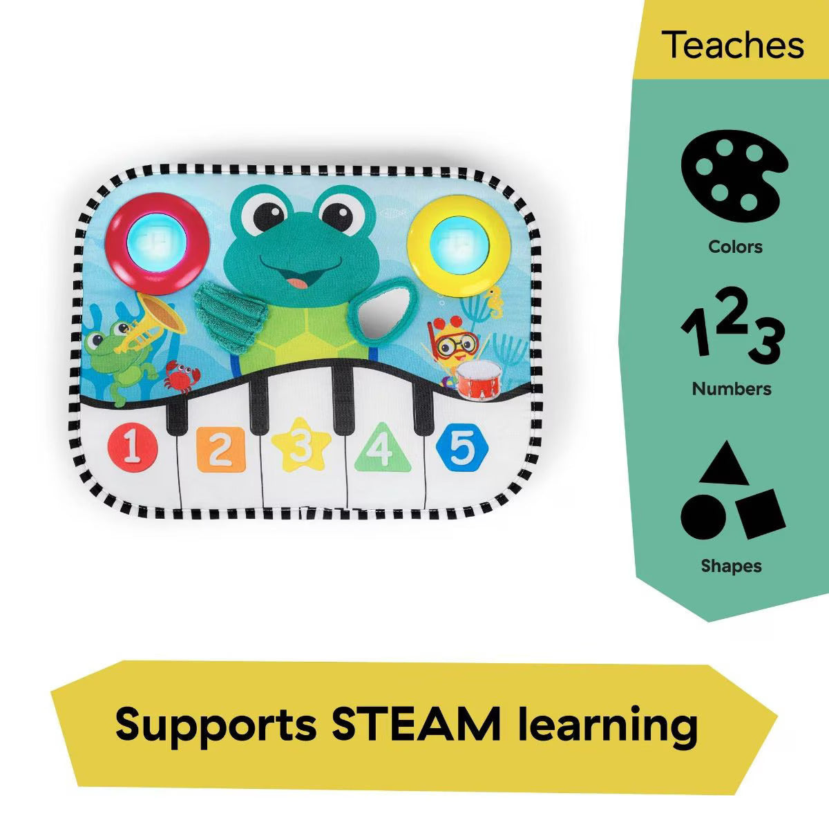 Baby Einstein Ocean Explorers Musical Kick Pad and Crib Unisex Infant Toy, Baby will get a kick out of musical discovery with Baby Einstein Ocean Explorers Neptune's Kick and Explore Musical Kick Pad and Crib Toy, a soft, unisex musical toy that helps baby explore melodies, create original songs, and learn letters, numbers, and shape names. Featuring Neptune, the Turtle from the Baby Einstein Ocean Explorers show, the baby can jam and discover 3 languages during crib play, tummy time, or sitting up. Includes 3 ways for baby to play. In Piano Mode, the baby can create original marimba sounds with every kick. Choose Melody Mode to help baby play along to pre-recorded jingles and sounds, or Discovery Mode to introduce shapes, colors, and numbers in 3 languages English, French, and Spanish. This vibrantly colored kick pad easily attaches to the baby's crib via ties and transforms into a floor toy for tummy time or seated play. Requires 3 AA batteries. Suitable for newborn.