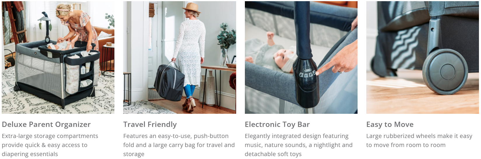 As your little one grows, the mattress transitions to the floor of the playard to offer an extra-large space for your toddler to play or sleep. Large, rubberized wheels allow for easy maneuvering from room to room. A staple at home for everyday use, the push-button fold and large carry bag make it perfect for travel too.