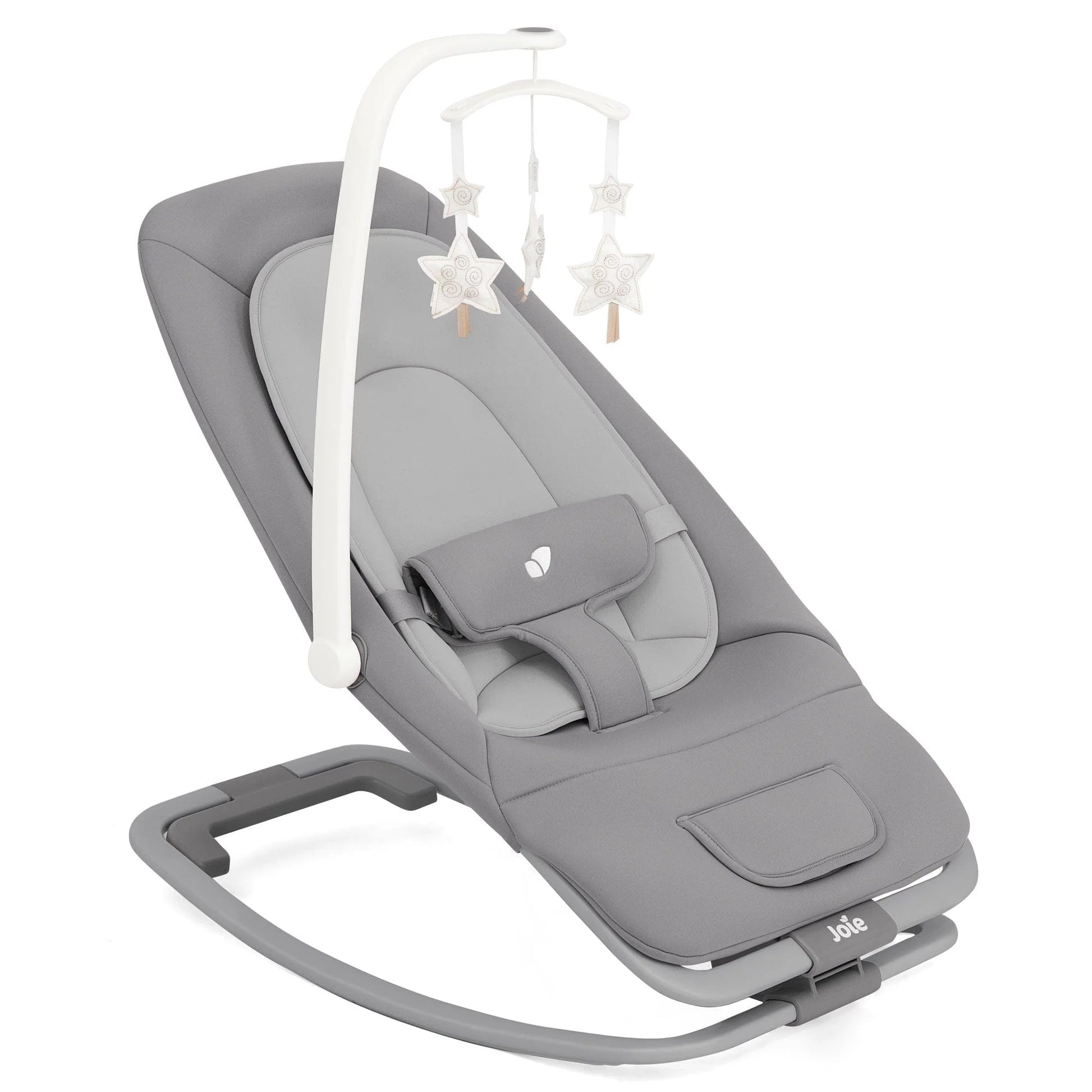 - Rock stop foot flips down to convert to stationary seat when you need them still